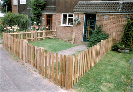 an example of palisade fencing using mortised posts, arris rails and upright palisades. The wood is pressure treated. The photo shown features a three foot gate, two-