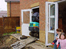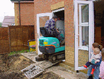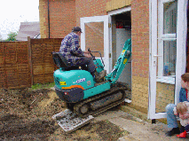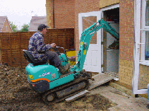 Designed to fit through a standard doorway width of 750mm! See the example to the right. The excavator is available with several attachments, including a 6" bucket, 9" bucket,12" bucket,18" bucket, 24" riddling bucket, grader, ripper tooth, rake and a grip talon.